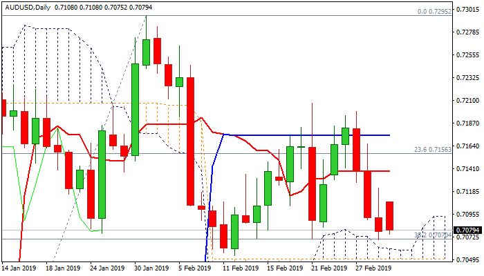 Fresh weakness pressures again key Fibo support at 0.7070 (38.2% of 0.6706/0.7295) which contained last Friday’s extension of three-day fall, after the support limited attacks in Feb.