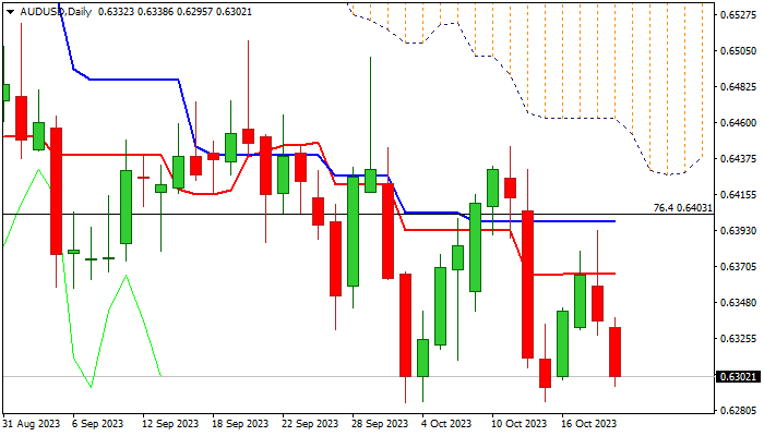 Limited recovery kept daily technical studies in full bearish mode, with fresh weakness increasing pressure on 2023 lows (0.6285/86 of Oct 3 / 13), break of which to signal continuation of larger downtrend and expose 2022 low (0.6170).