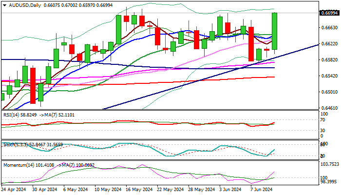 AUDUSD pair advanced 1.35% after release of data and cracked 0.6700 barrier, nearing full retracement of 0.6714/0.6575 pullback (the barrier is reinforced by the top of weekly Ichimoku cloud), and likely to provide headwinds for fresh bulls.