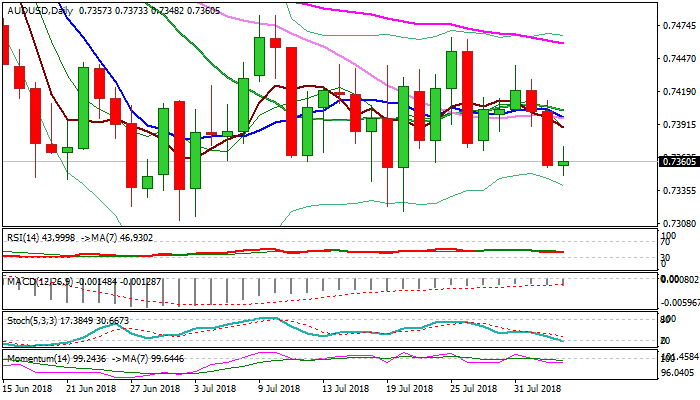 Near-term focus turns towards key supports at 0.7317/10 (20/02 July lows), with extended upticks to be capped under 0.7400 zone (converged 10/30SMA’s).