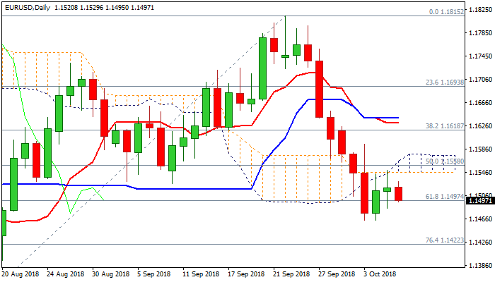 Fresh bears are probing again below cracked pivotal support at 1.1497 (Fibo 61.8% of 1.1300/1.1815 ascend) for renewed attack at 1.1563 double-bottom (03/04 Oct low) to signal continuation of downtrend from 1.1815 (24 Sep high) towards 1.1422 (Fibo 76.4%).