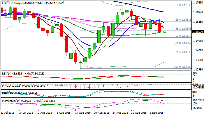 Bears pressure initial support at 1.1517 (50% of 1.1300/1.1733 / daily Kijun-sen), with weekly 100SMA (1.1483) and Fibo 61.8% (1.1466), coming in focus.