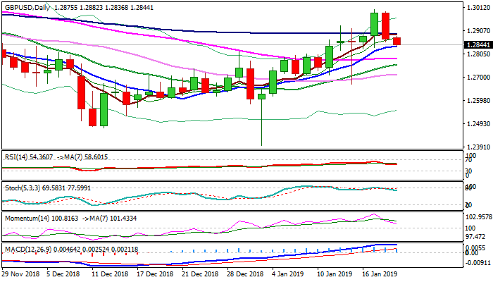 Fresh extension lower penetrated daily cloud (cloud top lays at 1.2866) and cracked 10SMA (1.2840), also top of rising 4-hr cloud, which is narrowing and could attract bears, showing scope for test of next pivotal support at 1.2800 (Fibo 38.2% of 1.2476/1.3000).