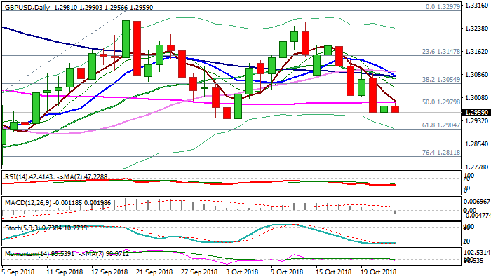 Bearish signals could be expected on firm break below key supports at 1.2921 (03/04 Oct lows) and 1.2904 (Fibo 61.8% of 1.2661/1.3297), which would signal bearish continuation towards 1.28 zone (Fibo 76.4% at 1.2811 and 05 Sep trough at 1.2785).