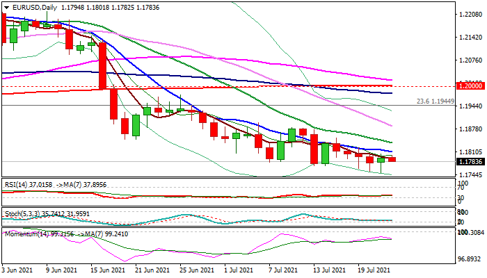 Falling 10DMA (1.1811) and 20DMA (1.1838) track the downtrend from early June and mark solid resistances, with close above these indicators to sideline immediate downside risk.
