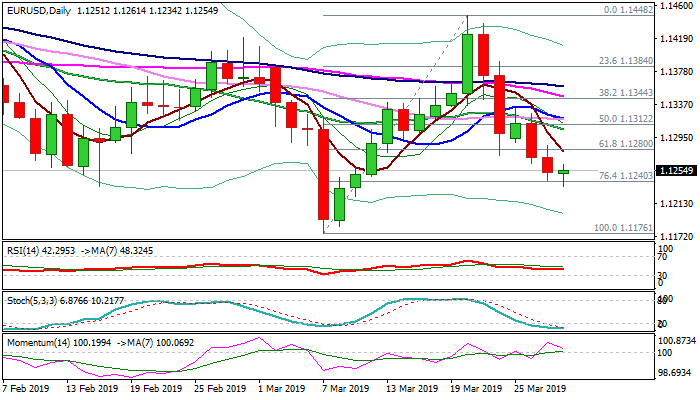 The Euro consolidates above cracked Fibo support at 1.1240 (76.4% of 1.1176/1.1448) in European session on Thursday after bears extended to new low at 1.1234 (the lowest since 11 Mar).