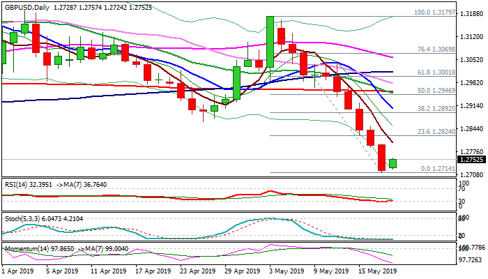Cable consolidates above multi-month low at 1.2714 on Monday after suffering heavy losses last week. The pair was down 2.1% for the week, as bears were additionally boosted by collapse of Brexit talks between Tory and Labor party.