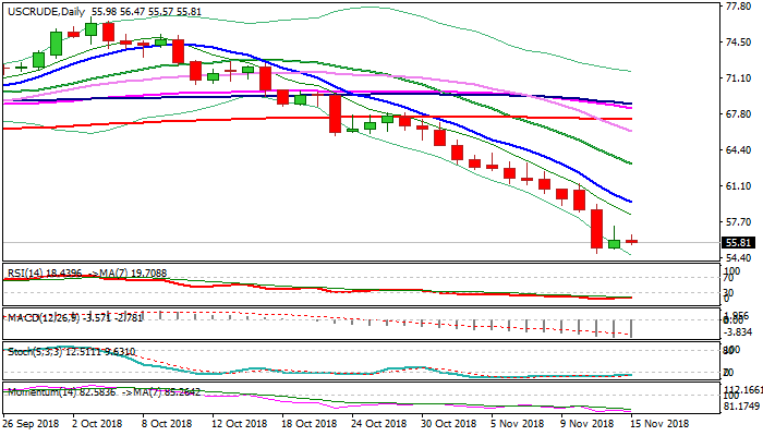Oil needs a catalyst to spark recovery, as the price so far showed no reaction on strongly oversold daily techs, as bears generated another signal on violation of important $55.35 support (Fibo 61.8% of $42.04/$76.88 rally, but weekly close below is needed to confirm signal.