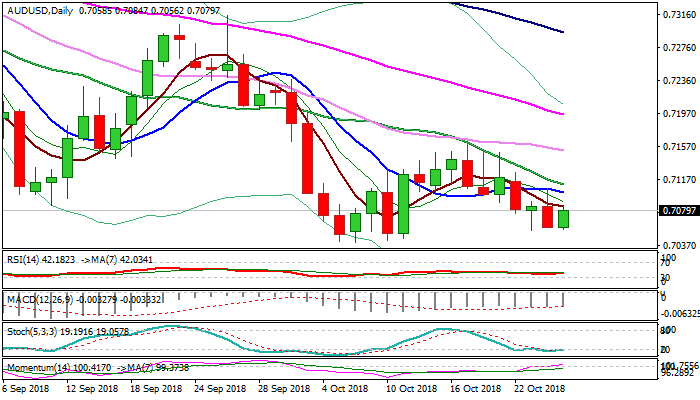 Momentum broke into positive territory and slow stochastic is about to reverse from oversold zone, supporting idea of stronger recovery, but extension and close above 0.7102/10 (10SMA / base of 4-hr cloud / falling 20SMA) is needed to confirm scenario and sideline existing risk of retesting key support – 0.7040 zone base.