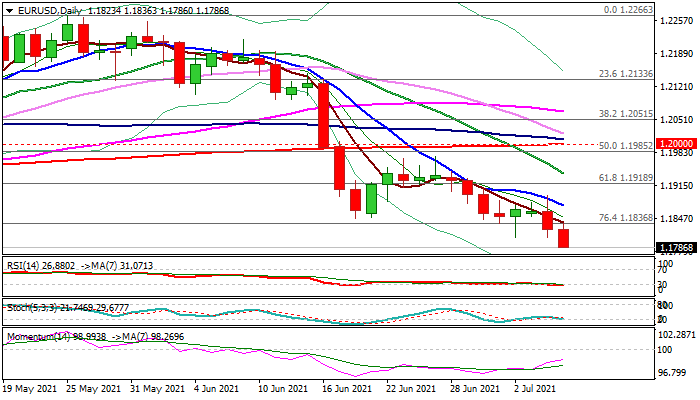 Broken supports at 1.1836/47 (Fibo 76.4% / former low of June 18) reverted to resistances, followed by falling 10DMA (1.1873) which tracks the downtrend for over one month.