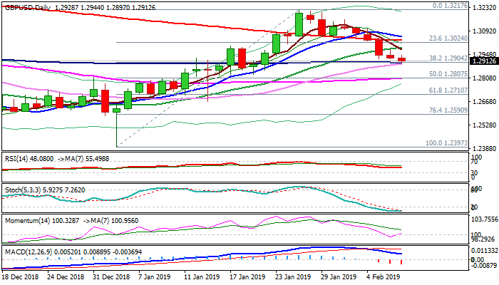 Sustained break here would trigger fresh bearish acceleration towards 1.2806 (55SMA) and 1.2786 (daily cloud top).