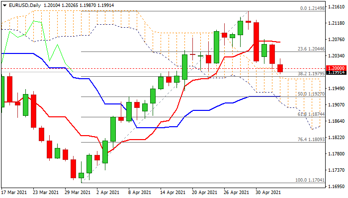 Bull-trap above 1.2102 Fibo barrier and last Friday’s massive bearish candle weigh on Euro as bears pressure next key supports at 1.1979/73 (Fibo 38.2% of 1.1704/1.2149/daily cloud top), loss of which would generate strong bearish signal for extension towards 1.1941/27 (200DMA / 50% retracement) and 1.1899 (daily cloud base) in extension.