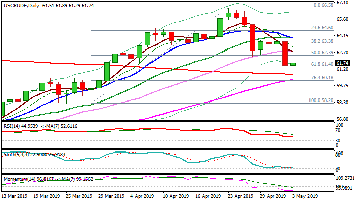 WTI oil consolidates after strong fall on Thursday (3.2%) as bears stalled on approach to 200SMA ($60.71) and subsequent bounce resulted in close above cracked Fibo support at $61.40 (61.8% of $58.20/$66.58 upleg).