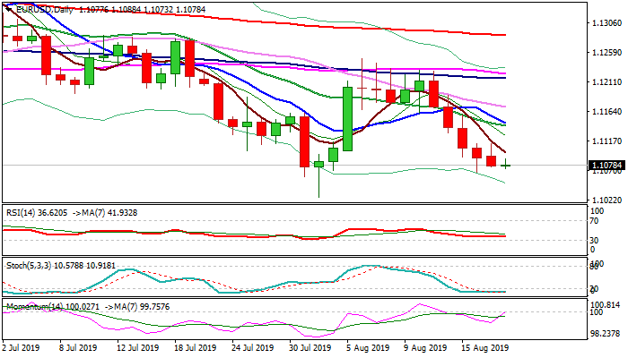 The single currency is pressured by strong dollar and political instability in Italy that keeps risk of final attack at psychological 1.10 support, however, further hesitation ahead of 1.10 pivot should be anticipated, as daily stochastic is deeply oversold and momentum is rising.