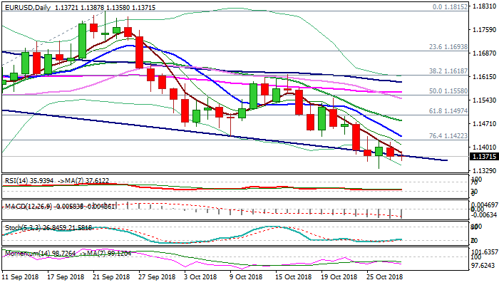 Monday’s bearish candle weighs on near-term action, with bearish daily techs accompanied with weaker than expected German labor data and Italian GDP, keeping negative bias.