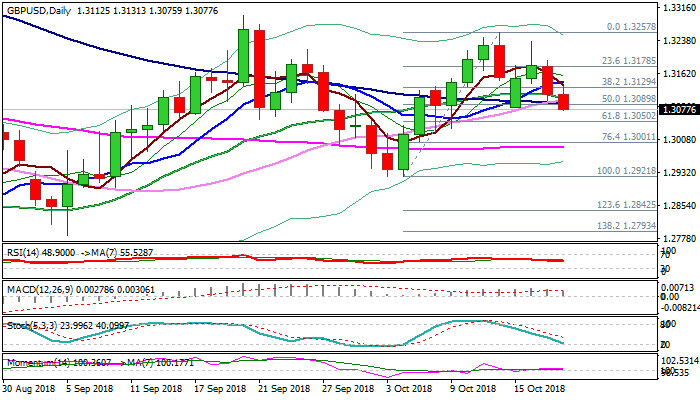 Cable attacks 1.31 support after recovery attempts stalled at 1.3130 (broken Fibo 38.2% of 1.2921/1.3257 upleg), as dollar returns to bullish path for extension of hawkish Fed-inspired rally.