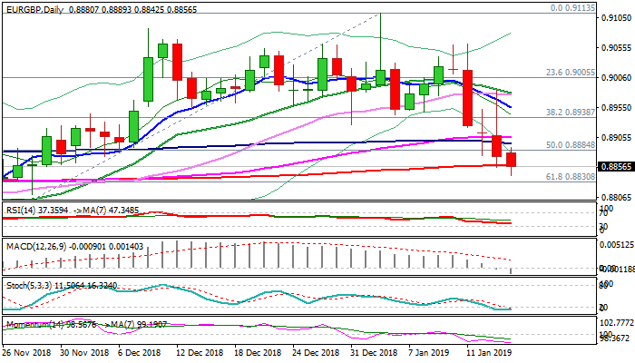 The single currency maintains negative near-term sentiment, with bearish setup of daily studies adding to bearish outlook, while pound resisted negative impact from Brexit plan vote down and recovered losses.