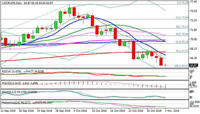 Steep downtrend from $76.88 (03 Oct peak) remains intact and looks for break below $64.43 pivot to extend weakness towards next key supports at $63.66/57 (top of rising daily cloud / Fibo 38.2% of $42.04/$76.88 uptrend).