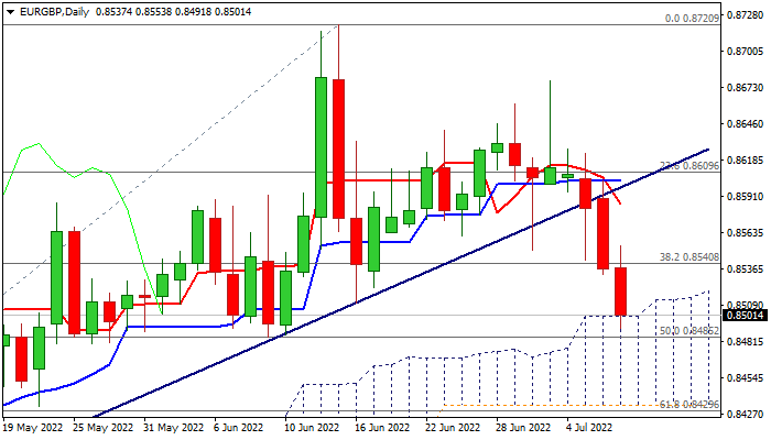 The cross extends a steep fall into third consecutive day and cracks significant support at 0.8501 (top of thick ascending daily Ichimoku cloud).