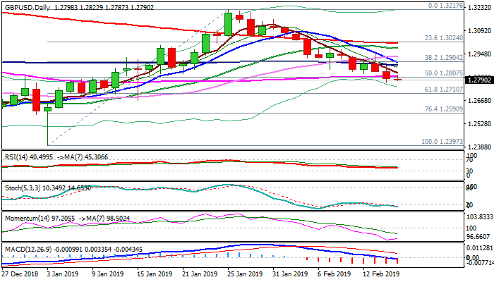 Bearish bias would remain intact while 100SMA caps and would keep focus at daily cloud top, violation of which would generate fresh bearish signal for test of 1.2710 (Fibo 61.8% of 1.2397/1.3217).