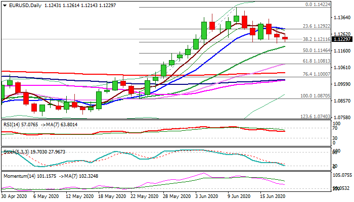 Bears attack again key support at 1.1212 (Fibo 38.2% of 1.0870/1.1422 / 17/12 June lows), where two attempts so far stalled.