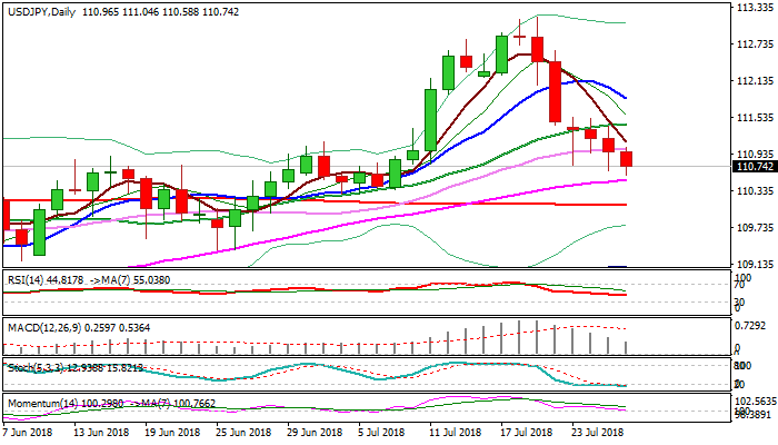 The dollar was additionally pressured by positive tone from US/EU trade talks and fresh weakness attempts at strong supports at 110.64/51 (50% of 108.11/113.17 / rising 55SMA) clear break of which would trigger further bearish extension towards strong supports at 110.00 zone (200SMA / Fibo 61.8% / daily cloud top).