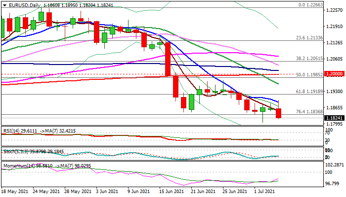 Bears regained control after brief consolidation was capped by falling 10DMA and fresh weakness is on track for eventual close below cracked pivot at 1.1836 (Fibo 76.4% of 1.1704/1.2266 upleg).