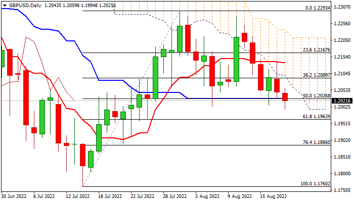 Daily technical studies show rising negative momentum and moving averages in bearish setup, with near-term action being pressured and capped by the base of falling and thickening daily Ichimoku cloud, although headwinds from key 1.20 support zone (Fibo 38.2% of 1.1760/1.2293 / daily Kijun-sen at 1.2026 and psychological 1.20 support) persist and may keep the action in extended consolidation before bears resume.