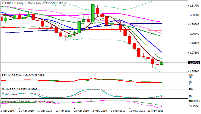 Upticks were so far capped by initial resistance at 1.2687 (falling 5SMA) ahead of more significant 1.2763 barrier (falling 10SMA) which should ideally cap and guard pivot at 1.2824 (Fibo 38.2% of 1.3179/1.2605 descend).