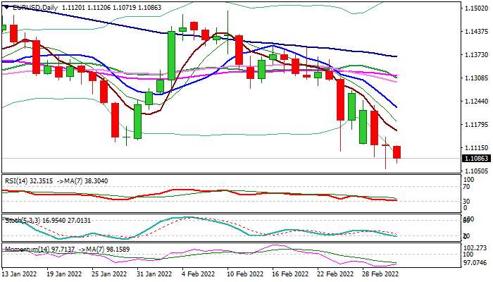 Deteriorating geopolitical situation on continuing clashes in Ukraine, fears of stronger impact of massive sanctions imposed to Russia, as energy prices continue to rise and surge in EU’s producer prices, weigh strongly on the single currency, also pressured by strong risk aversion.