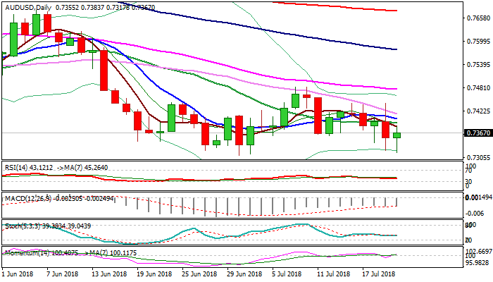 Bears need confirmation on close below cracked pivot at 0.7325 (Fibo 61.8% of 2016/2018 0.6825/0.8135 uptrend) to generate bearish signal for fresh leg lower.