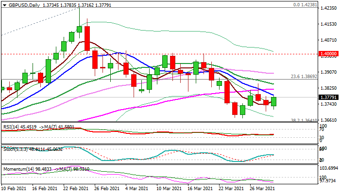 The recovery of two-day drop so far stays below pivotal barriers provided by 10 DMA (1.3789) and 55DMA (1.3820), weighed by Monday’s strong upside rejection that left bearish daily candle with long upper shadow and points to strong offers.