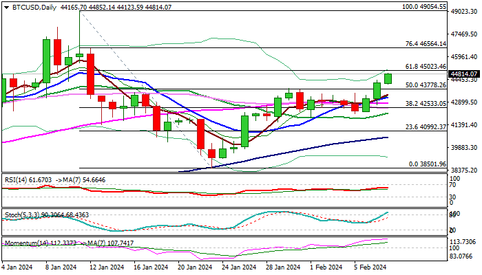 Fresh bulls pressure pivotal barriers at 45000/45023 (psychological / daily cloud top / Fibo 61.8% of 49054/38501 correction), break of which would generate strong bullish signal for extension of the third wave of recovery phase from 38501 and expose targets at 46000 (round-figure) and 46564 (Fibo 76.4%).