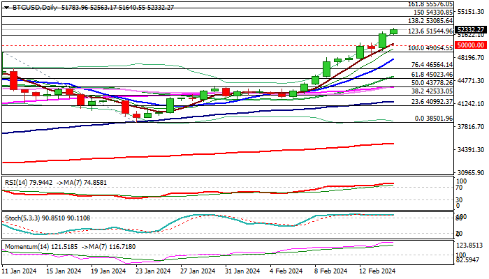 Bulls hit new high at 52563 and focus next target at 53085 (Fibo 138.2% projection of the upleg from 38501), with stronger bullish acceleration to expose barriers at 55576 (Fibo 161.8% projection) and 56291 (Fibo 76.4% retracement of 68911/15434 downtrend).