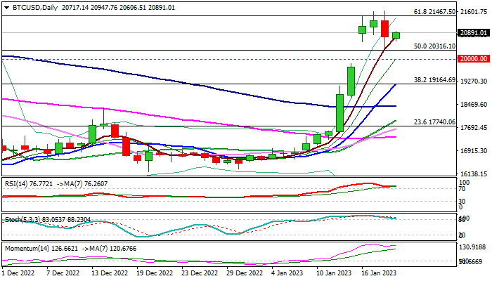 Firm break of cracked Fibo barrier at 21467 (61.8%) would generate fresh bullish signal for acceleration towards 22892 (Fibo 76.4%) and 24547 (200WMA) in extension.