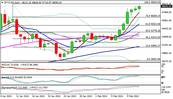 Bitcoin keeps firm tone and holds near one-month high on Monday, after advancing 12.5% last week (the biggest weekly gains since mid-Oct 2021) however, narrower ranges in past three days suggest that bulls might be running out of steam on approach to key barrier at 49054 (Jan 11 peak, the highest since late Dec 2021).