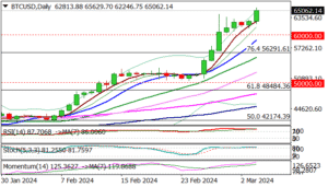 Fresh rise above 65000 (the highest since November 2021) confirms very strong bids and very low supply, despite negative technical signals from overbought studies.