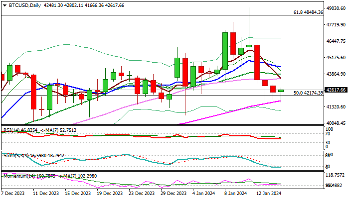 Bitcoin keeps slight bid in early Monday’s trading, after sharp fall in past few sessions, as daily studies are oversold, and fresh bears faced strong headwinds from rising daily cloud (top of the cloud lays at 41311).