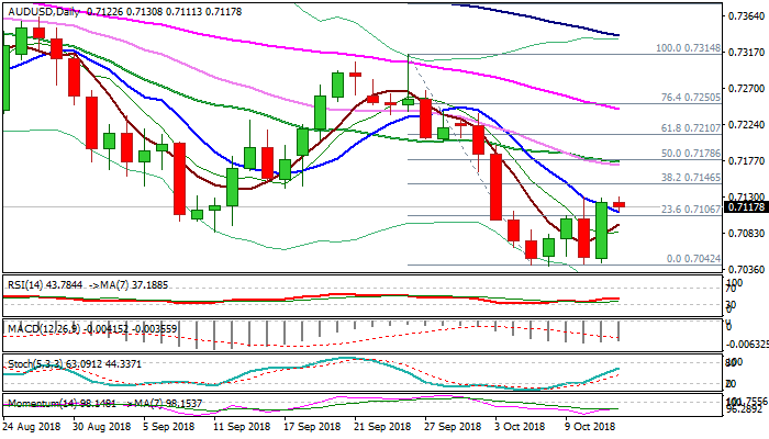 Multiple downside rejection formed a base at 0.7042, with subsequent bullish acceleration which broke above falling 10SMA (currently at 0.7110) are supportive factors, along with strengthening momentum and north-heading slow stochastic on daily chart.