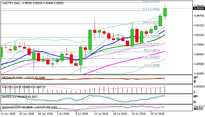 The USDTRY pair rallies in uncharted territory after strong rally on Wednesday eventually broke above psychological 5.00 barrier and extended higher on Thursday.