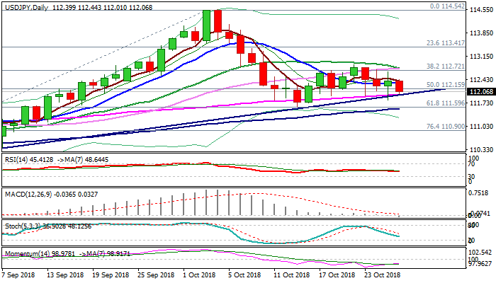 Despite fresh weakness, mixed daily techs do not provide firmer direction signal, with close below 55SMA / trendline, needed weaken near-term structure for test of key supports at 111.62/56 (15 Oct low / Fibo 61.8% of 109.77/114.54 / rising 100SMA).
