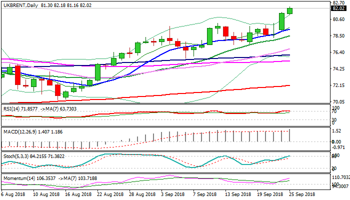 Brent oil maintains firm tone on Tuesday and hit new four-year high at $82.18, in extension of strong rally on Monday.