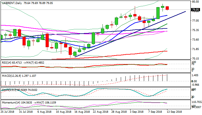 Today’s strong close in red would complete reversal pattern on daily chart and signal further weakness towards pivotal supports at $77.98 (rising 10SMA) and $77.71 (bull-trendline drawn off $70.39 (16 Aug low).
