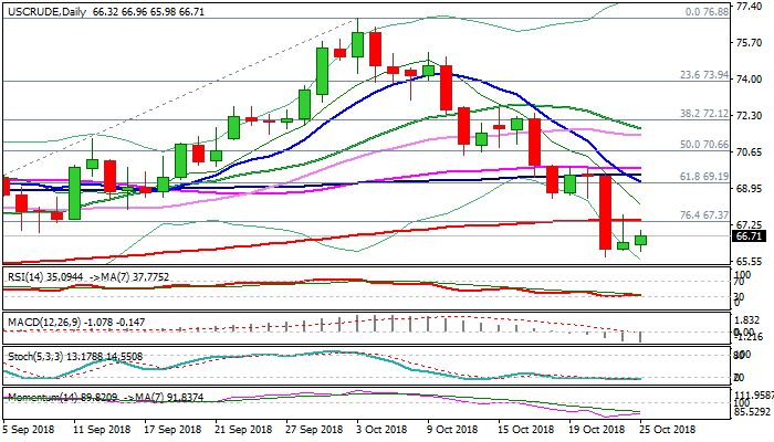 Stronger recovery could be anticipated on sustained break above 200SMA, which would expose broken Fibo 61.8% of $64.43/$76.88 / falling 10SMA ($ 69.19/23) and $70 pivot (psychological barrier / Fibo 38.2% of $76.88/$65.73 fall).