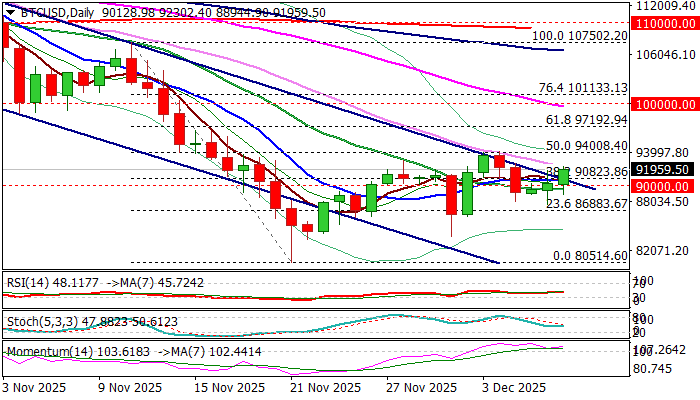 Recovery leg extends into third straight day and accelerated on Monday (up 2.2% until mid-European session), with fresh bullish signals generated on lift above bear-channel upper boundary (90700) and Fibo 38.2% of 107502/80514 descend (90823).