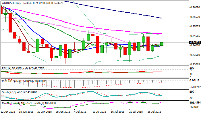 Close above broken Fibo barrier at 0.7428 (61.8% of 0.7464/0.7370 fall) is needed to confirm bullish stance for extension towards key n/t barrier at 0.7464 (25 / 26 July tops), reinforced by falling 55SMA.
