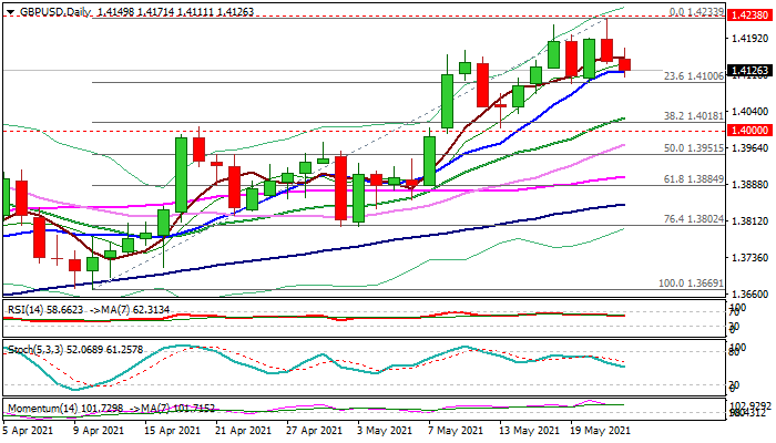 Caution on firm break of 1.41 zone, as many stops have been parked below this level that could spark fresh acceleration lower and expose supports at 1.4020/1.4000 zone (20DMA / Fibo 38.2% of 1.3669/1.4233 / psychological).