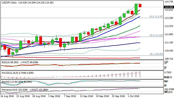 Strong bullish acceleration on Wednesday (the biggest one-day gain since 11 July) hit new eleven-month high at 114.54, as dollar enjoyed strong support from upbeat US data and hawkish tone of comments from Fed chief Powell.