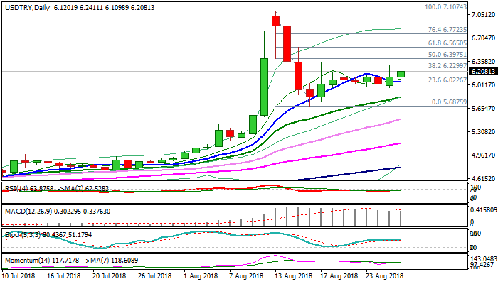 Turkish lira remains under pressure on Tuesday, with negative outlook and fears of significant losses in the near future. Negative sentiment is additionally boosted by concerns about further rise of inflation (report is due on 03 Sep) and decision of Turkish central bank on monetary policy meeting on 13 Sep.