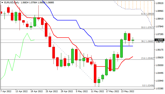 The action stays above broken Fibo barrier at 1.0668 (38.2% of 1.1184/1.0349) and daily Kijun-sen (1.0643) which turned to solid supports and maintain near-term bullish bias.